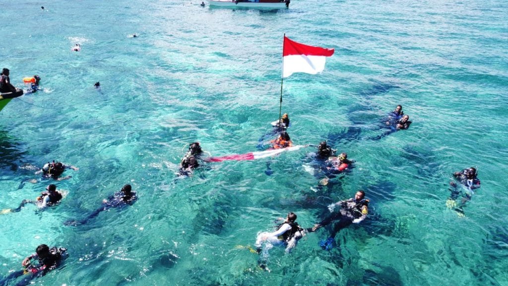 Maumere, Ekorantt.com – Sekitar 22 penyelam membentangkan bendera merah putih di perairan Teluk Maumere, tepatnya di patahan gempa tahun 1992, sekitar 200 meter dari Pulau Babi pada Sabtu (15/8/2020).