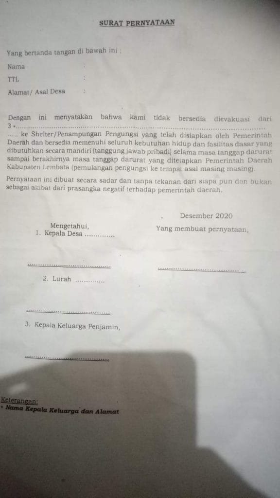 “Dimohon perhatian terhadap arahan bupati ini, bahwa terdapat reaksi publik yang beragam terkait surat pernyataan bagi warga yang tidak mau dievakuasi terpusat. Niatnya bukan untuk membunuh warga, bukan untuk sengsarakan warga, bukan untuk mengancam warga dan lain-lain. Niat pemerintah adalah untuk memaksimalkan penanganan/perhatian/pelayanan terhadap warga yang selama ini mengeluh belum tersentuh pelayanan logistik dan kesehatan termasuk untuk menghindari hal-hal yang tidak diinginkan seperti kematian dan lain-lain. Oleh karena tidak mendapat sentuhan pelayanan kesehatan dengan baik di rumah.”