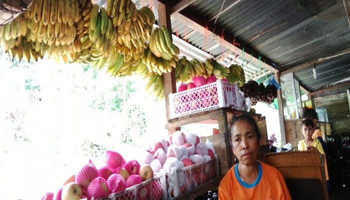 Fabiana Lini, pedagang pisang di pinggir Jalan Trans Flores, kini harus mendatangkan pisang dari Kupang, Pulau Timor.