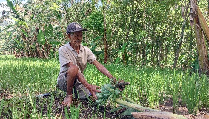 Ia mengaku tanaman pisang yang tumbuh di pinggir padi ladang tak sehat. Pucuk daunnya layu. Lantaran takut menyebar luas, ayah enam anak itu berencana menebang semua tanaman yang sudah berbuah.