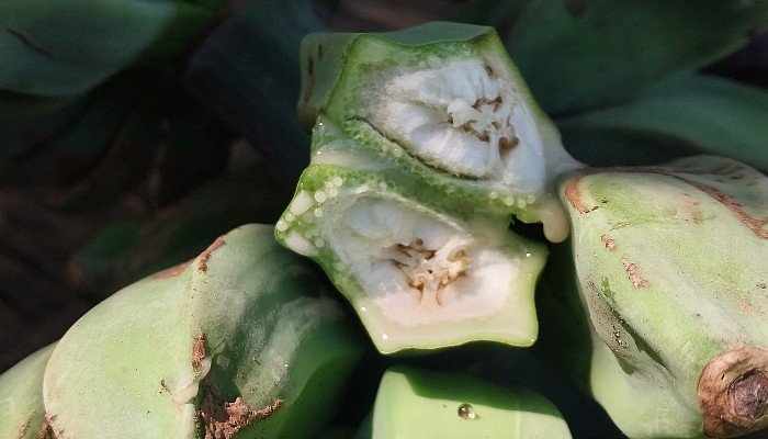 Gabriel Goliat Werang (82), menunjukkan tiga tandan pisang gagal panen. Dia lalu membelah satu sisir pisang. Isinya terlihat berair berwarna kuning. Ada pula yang buah besar namun isi di dalamnya kerdil.