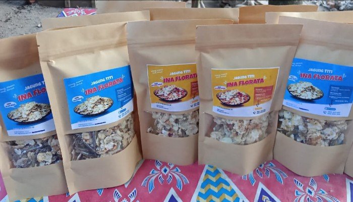Dari tangan pemipih jagung, Ina Florata mengolahnya lagi dengan margarin, garam, lalu dipanggang menjadi lebih renyah. Terdapat tiga varian, produk ini dikemas dengan kemasan yang ramah lingkungan.