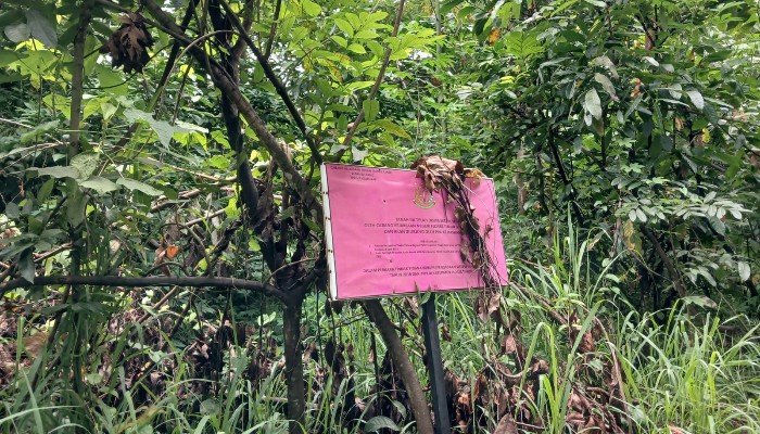 Pantauan Ekora NTT, Sabtu, 21 Februari 2026 pagi, papan penyitaan berwarna pink terpasang di pinggir Jalan Trans Flores Larantuka-Maumere.