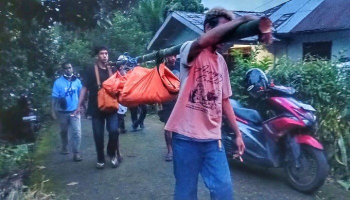 Jasad korban kemudian dibawa oleh tiga orang warga secara bergantian menuju mobil pikap untuk penanganan lebih lanjut.