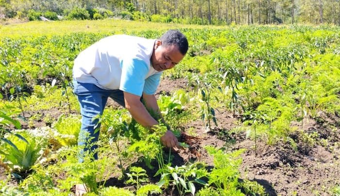 Bajawa, Ekorantt.com – Rofinus Rewu (52) sibuk membersihkan gulma dan rumput di kebun hortikultura yang berlokasi di Desa Sobo, Kecamatan Golewa Barat, Kabupaten Ngada pada Senin, 20 April 2026. Tangannya lincah meraih rumput liar, lalu dicabut dan dibuang di sekitar bedeng.